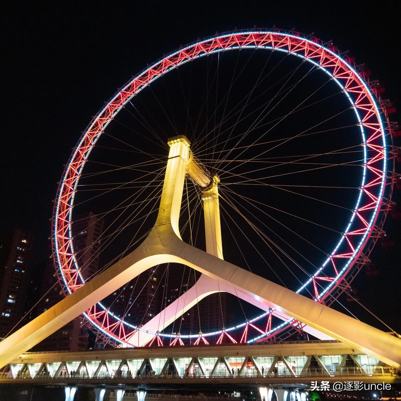 再向前一步,就是天津之眼了,是天津的地标性建筑!人们口中的分手摩天轮,殊不知这可是世界上唯一一座建设在桥上的摩天轮,转一周大约需要半个小时的时间,在最高处的时候可以看见整个天津,这么浪漫的地方,人多是必然的,要做好提前排队的准备,排两个小时真的也是值得,因为它实在是太美了!