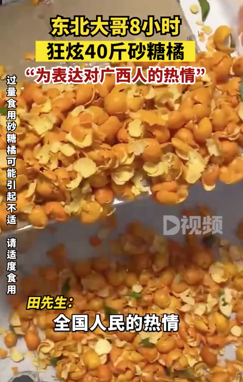 田先生表示:“吃了40斤左右,大概8个小时,后面已经吃不动了。全国人民都在以一种很开心的方式让广西朋友去剪砂糖橘,我觉得我也要让大家感受一下全国人民的热情。”
